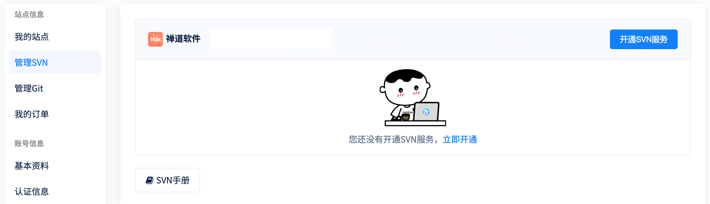 1. 点击“用户中心”下的“管理SVN”选项,可以开通SVN在线托管。