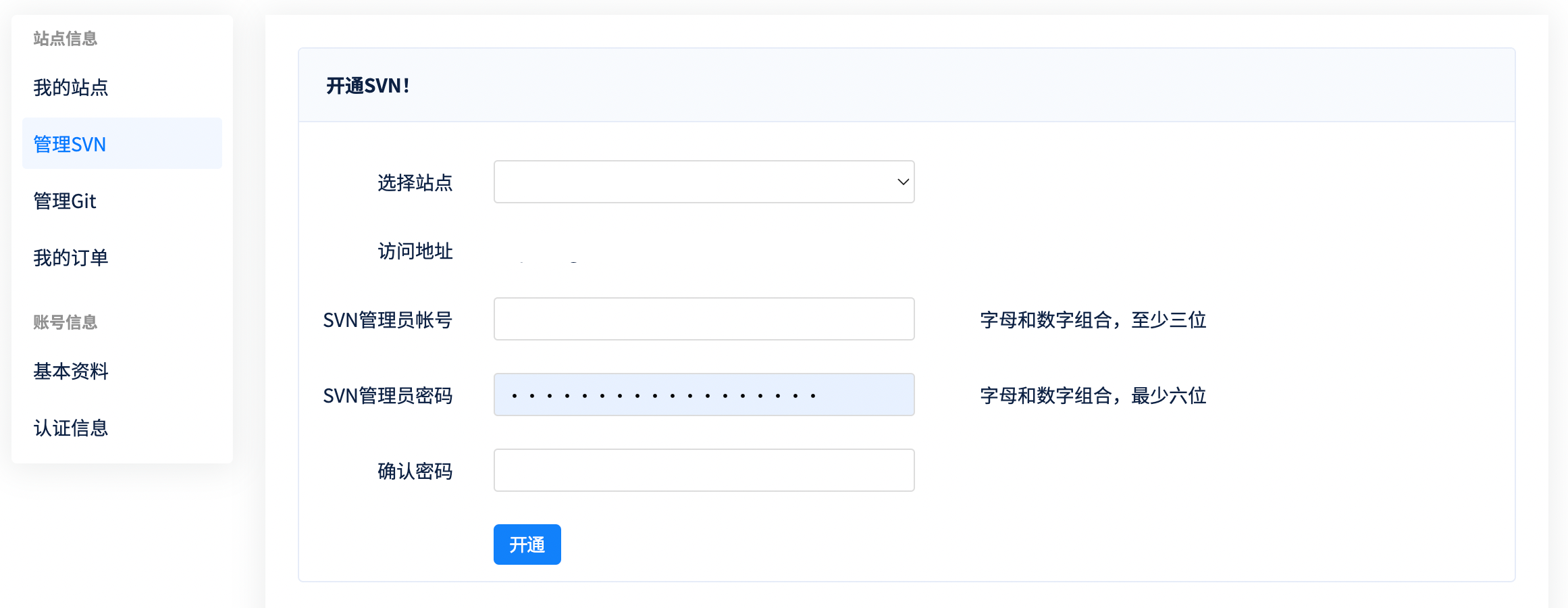 2. 开通时,需填写SVN管理员用户名和密码。
