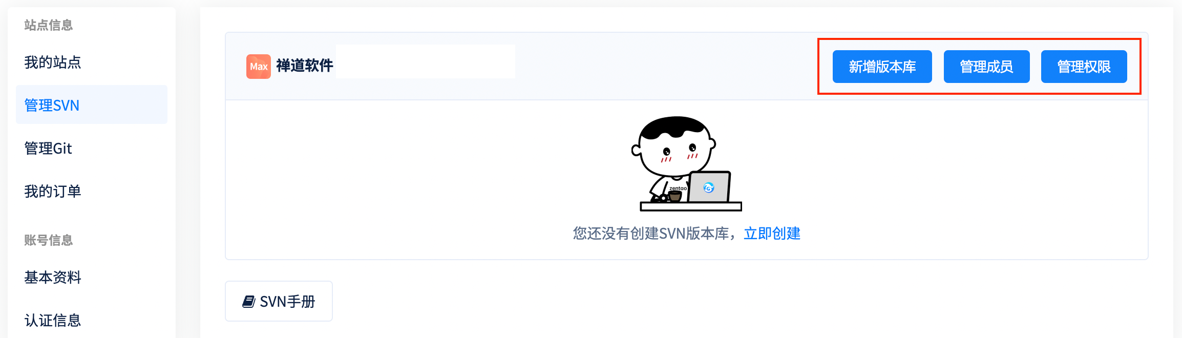 3. 开通成功后,可以添加版本库、管理该站点的SVN成员并设置权限。