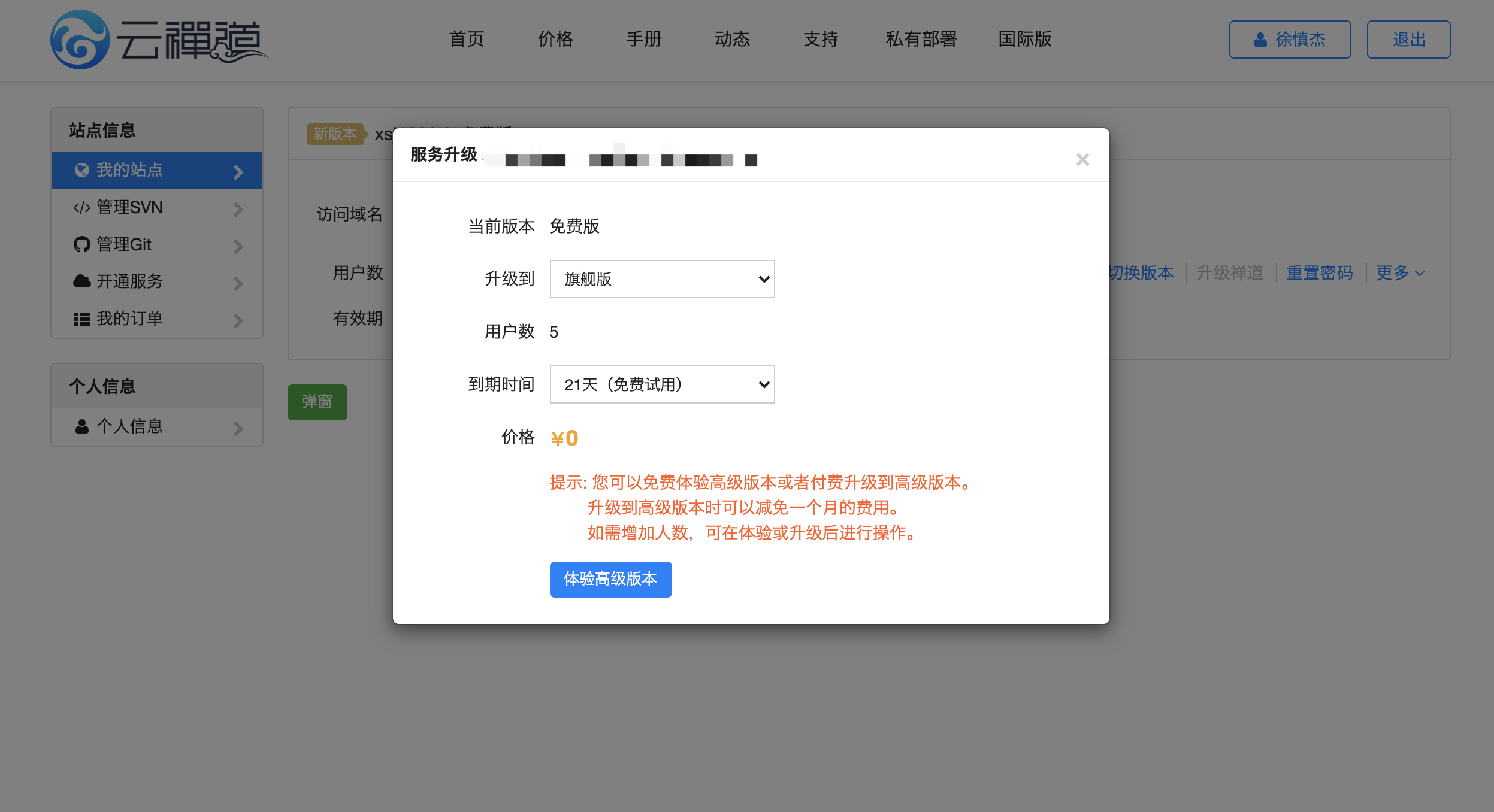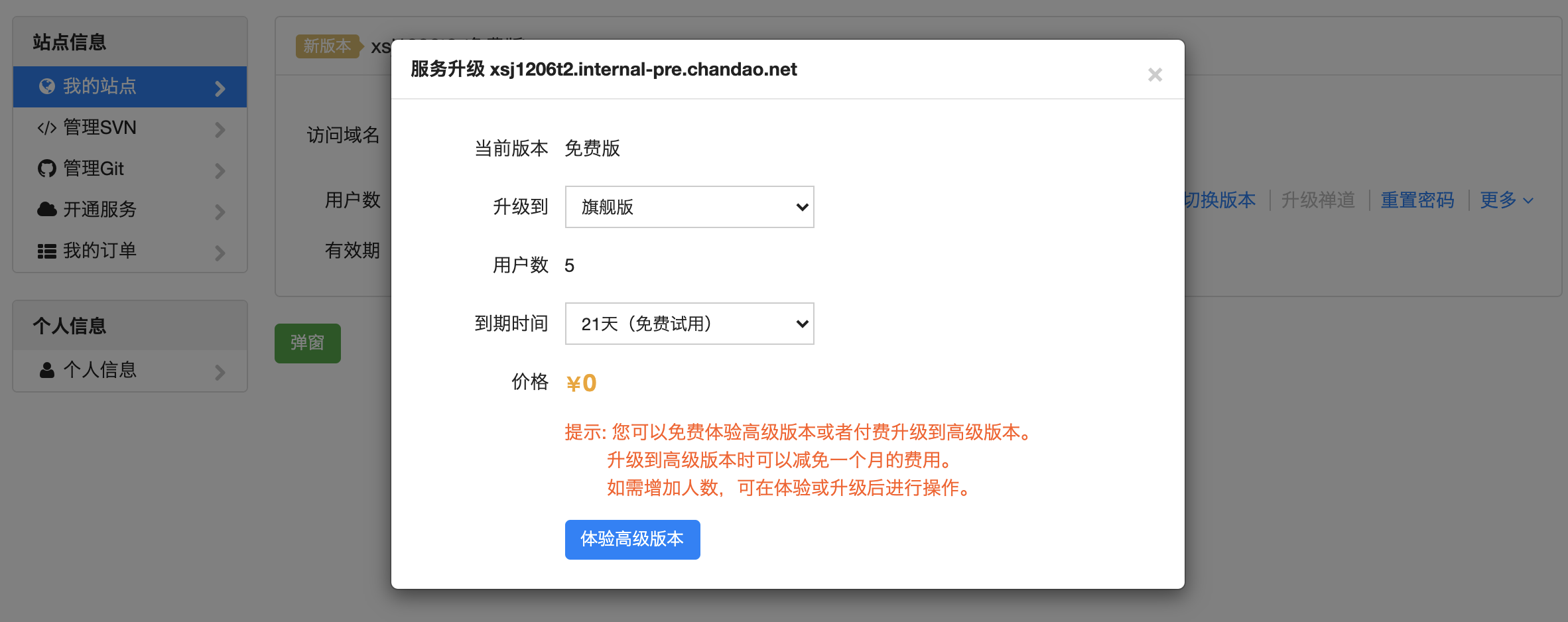 关于体验高级版本功能(免费站点升级高级版本,立享减免一月费用优惠):