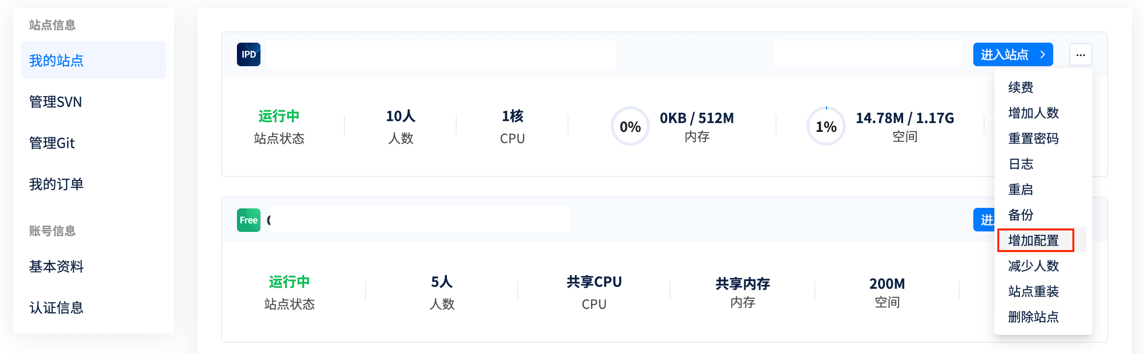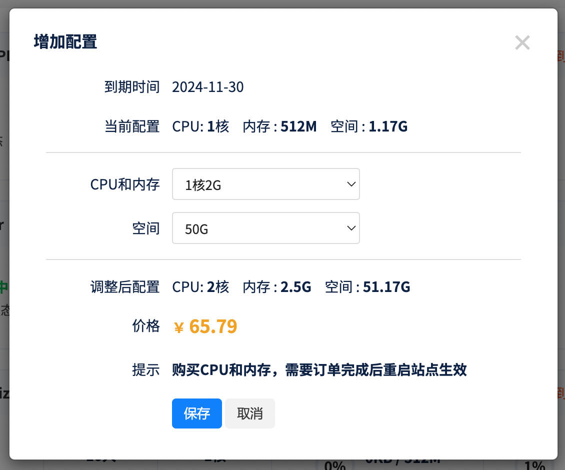 3. 当购买CPU和内存时需要重启站点,购买硬盘无需重启站点,选择合适的时间重启您的站点。