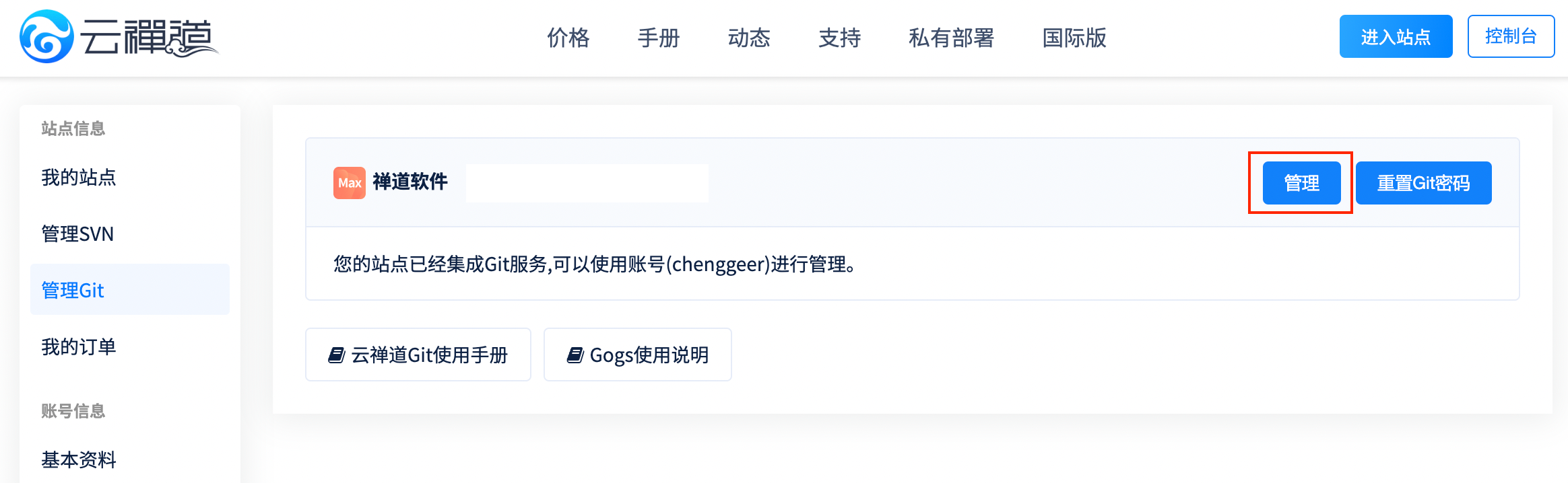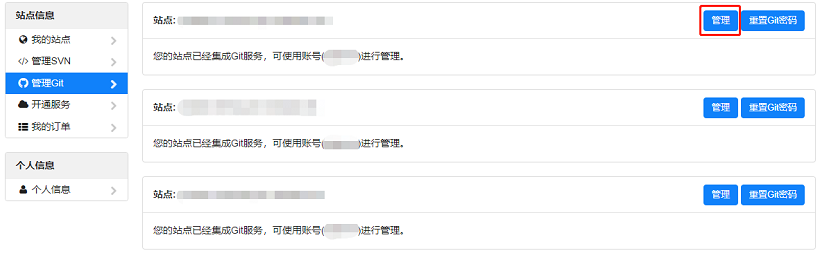 1、进入管理Git页面点击管理