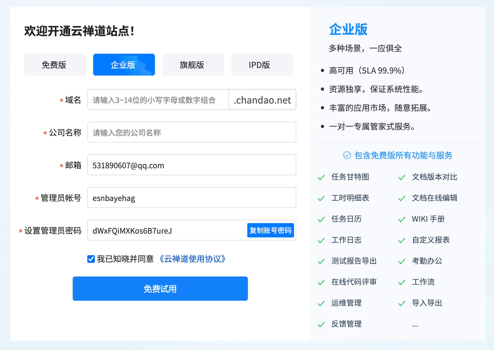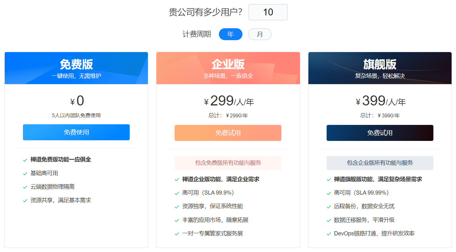 您可以通过云禅道价格介绍页面了解云禅道的价格体系,和不同版本的功能特点。您可以选择禅道企业版或旗舰版进行开通。