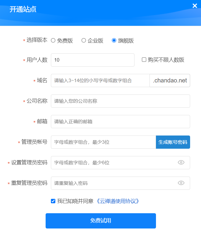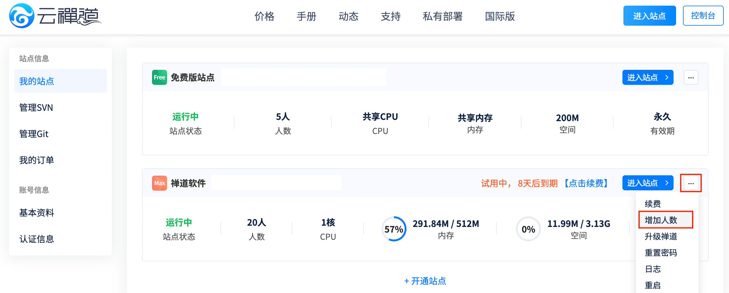 企业版、旗舰版、IPD 版站点默认 10 人,增加人数请到控制台-我的站点-增加人数。