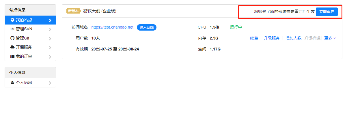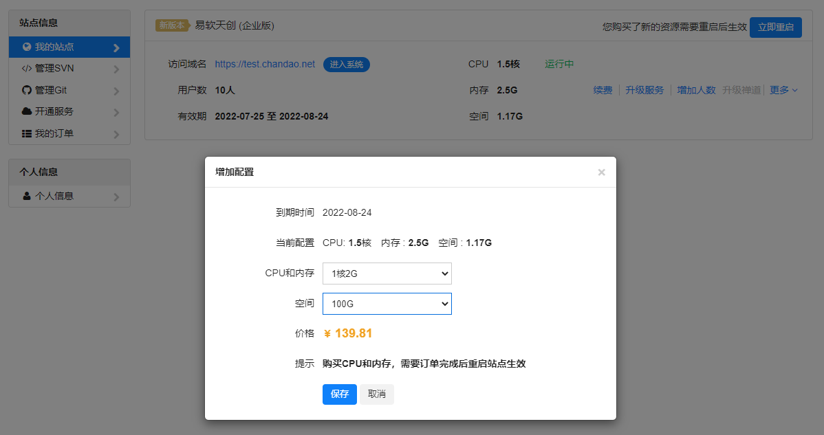 3. 当购买cpu和内存时需要重启站点,购买硬盘无需重启站点,选择合适的时间重启您的站点。