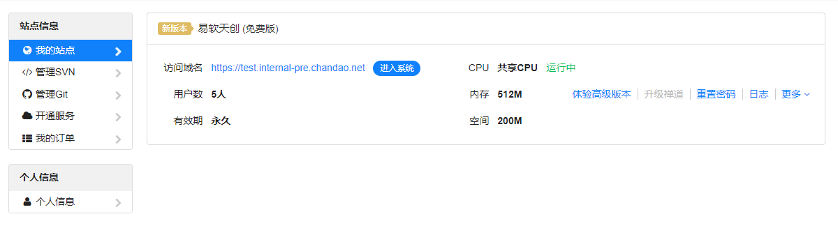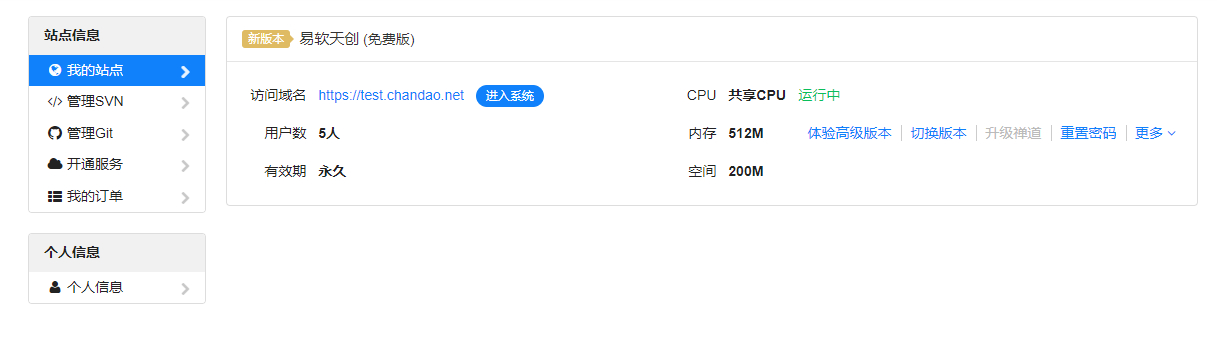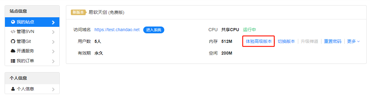 1、免费站点,在“我的站点”列表菜单中会有“体验高级版本”的按钮