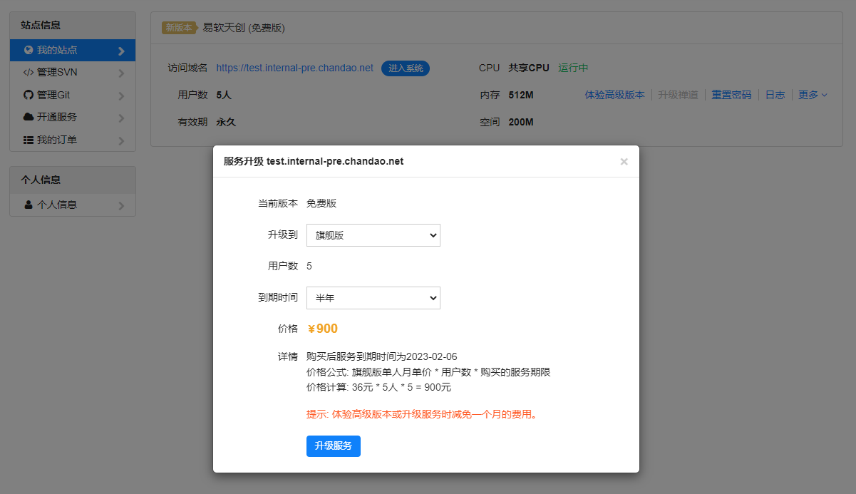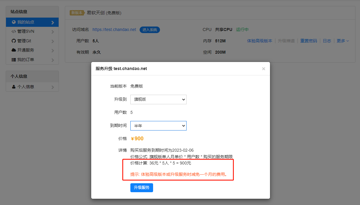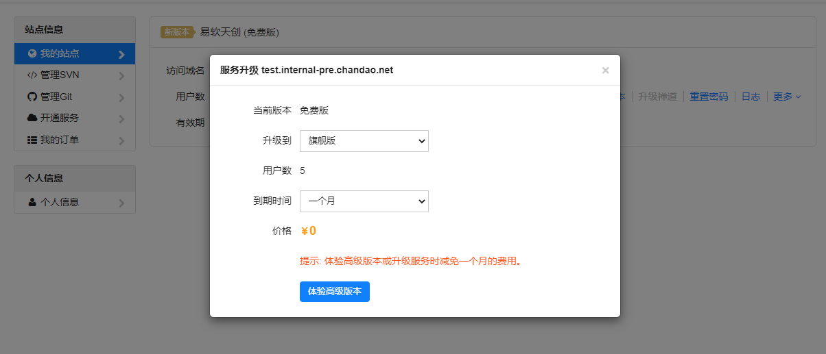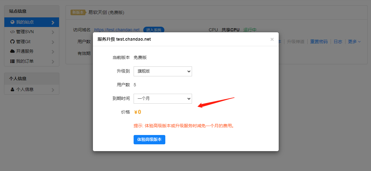6、升级版本减免一个月费用,仅限免费站点体验高级版本。