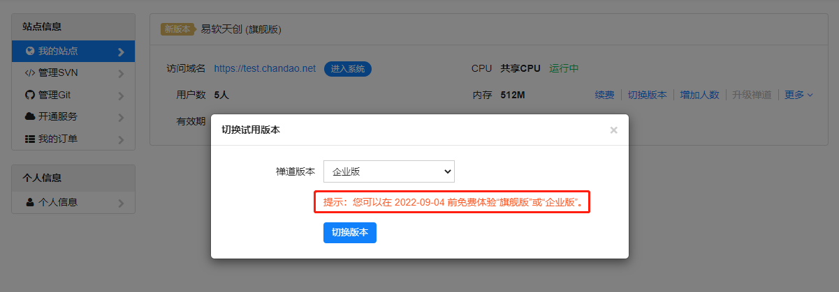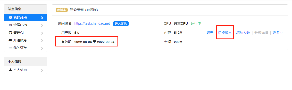 4、选择体验高级版本后,您的站点切换将到高级版本。从初次体验开始,您可以在一个月之内随时切换版本。